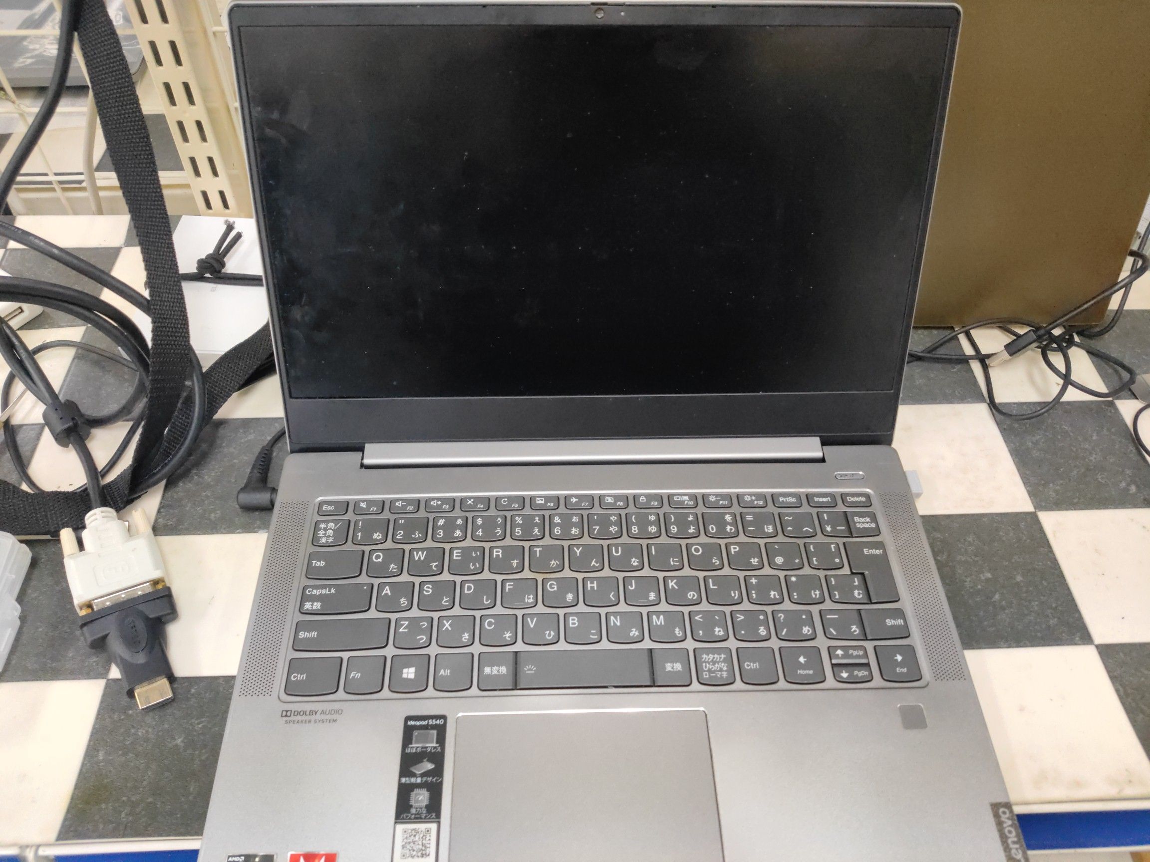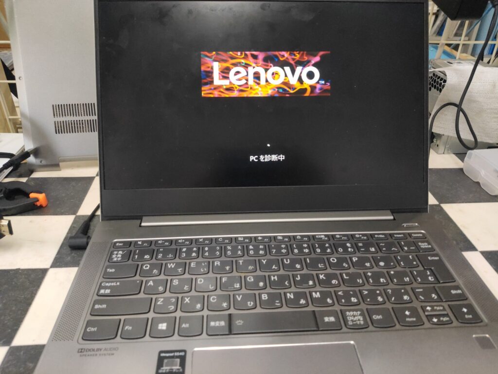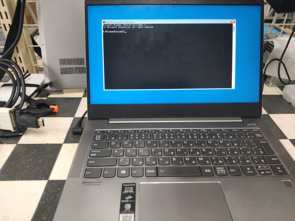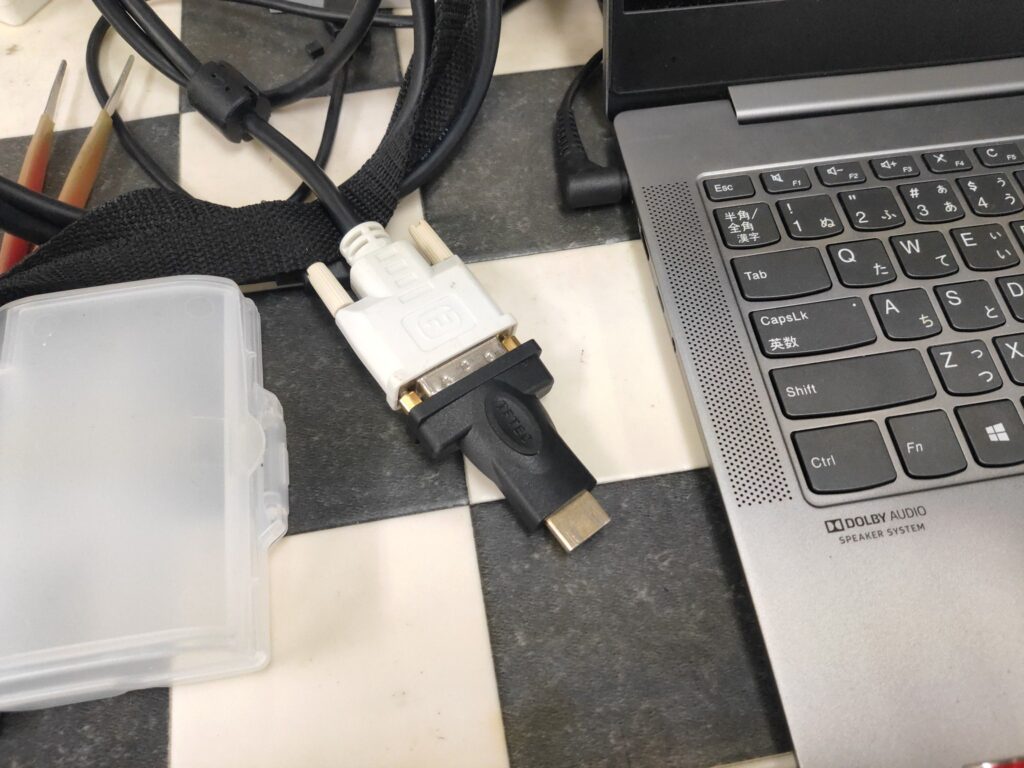 まずは外部モニタに映像が出るか確認します。これが出れば作業しやすいのですが、起動音はしますが出ません。